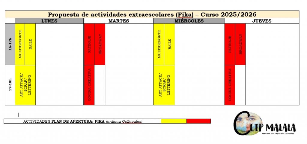 Fechas: Las actividades extraescolares comienzan el 1 de octubre y finalizan el 28 de mayo.